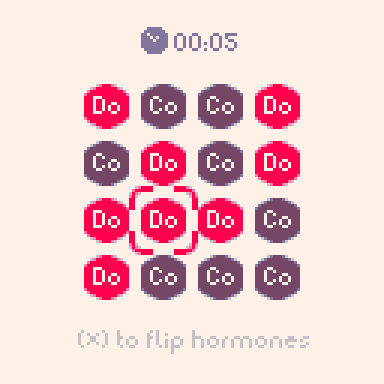 Your goal is to turn every cell red (Dopamine) before time runs out. Pressing (X) on a cell flips it, but it also flips all its adjacent cells (up, down, left, and right)